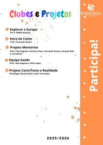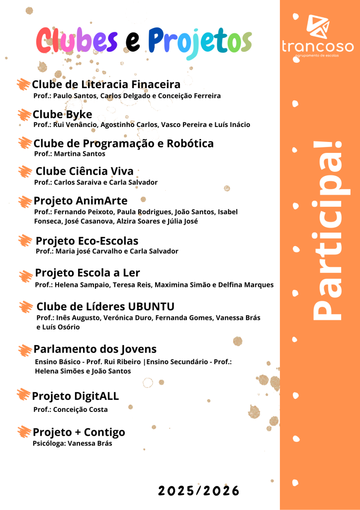 Ano Letivo 2025-2026 Clique nas imagens para ver + Participa! Inscreve-te! Clubes e Projetos na WEB eTwinning | AE Trancoso Erasmus+ AET – Projeto aprovado para 2024-25 Explorar a Europa Desporto Escolar | AE Trancoso Co(m)texto e Realidade Clube UBUNTO EPAS – Escolas Embaixadoras do Parlamento Europeu Projeto DigitALL em implementação no 1.º Ciclo ERASMUS | Mobilidades com Alunos 23-24 | A experiência Ano Letivo 2024-2025 Relatório 1.º Semestre 2024-25…. Relatório 2.º Semestre 2024-25…. Horários e Responsáveis Em breve